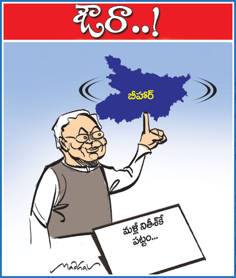 15 Nov Cartoon | ఆంధ్రప్రభలో నేటి కార్టూన్ ఔరా నితీశ్ గెలుపై చమక్కు ఇది. జంగల్ రాజ్ పాలననుంచి విముక్తి కలిగించి శాంతిభద్రతలు నెలకొల్పిన నితీశ్ రుణం తీర్చుకుంటూనే ఉన్నారు బీహారీలు. ఈ ఎన్నికల్లో కూడా ఆయనకే పట్టం కట్టడం అందుకు నిదర్శనం. అట్నుంచిటు, ఇట్నుంచటు మారినా అవేమీ ఆయన గెలుపు గ్రాఫ్ పై ప్రభావం చూపకపోవడం గమనార్హం. పదేళ్ళకుపైగా శ్రమిస్తున్నా విజయం దక్కని తేజస్వి యాదవ్ కి ఈసారీ నిరాశ తప్పలేదు. బీహారీలు నితీశ్ పాలనను, ప్రశాంతమైన వాతావరణాన్ని కోరుకుంటున్నారని ప్రధాని చెప్పిన మాటలు అక్షరసత్యాలని ఓట్లతో చెప్పారు. జంగల్ రాజ్ పాలననుంచి విముక్తి కలిగించి శాంతిభద్రతలు నెలకొల్పిన నితీశ్ రుణం తీర్చుకుంటూనే ఉన్నారు బీహారీలు. ఈ ఎన్నికల్లో కూడా ఆయనకే పట్టం కట్టడం అందుకు నిదర్శనం. అట్నుంచిటు, ఇట్నుంచటు మారినా అవేమీ ఆయన గెలుపు గ్రాఫ్ పై ప్రభావం చూపకపోవడం గమనార్హం. పదేళ్ళకుపైగా శ్రమిస్తున్నా విజయం దక్కని తేజస్వి యాదవ్ కి ఈసారీ నిరాశ తప్పలేదు. బీహారీలు నితీశ్ పాలనను, ప్రశాంతమైన వాతావరణాన్ని కోరుకుంటున్నారని ప్రధాని చెప్పిన మాటలు అక్షరసత్యాలని ఓట్లతో చెప్పారు. జంగల్ రాజ్ పాలననుంచి విముక్తి కలిగించి శాంతిభద్రతలు నెలకొల్పిన నితీశ్ రుణం తీర్చుకుంటూనే ఉన్నారు బీహారీలు.
