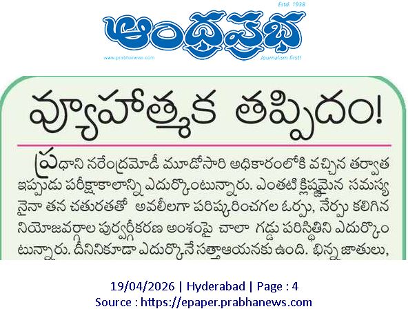 19thaprileditorial | ప్రధాని నరేంద్ర మోడీ మూడోసారి అధికారంలోకి వచ్చిన తర్వాత ఇప్పుడు పరీక్షా కాలంను ఎదుర్కొంటున్నారు. ఎంతటి క్లిష్టమైన సమస్యనైనా తన చతురతతో అవలీలగా పరిష్కరించగల ఓర్పు, నేర్పు కలిగిన ఆయన నియోజకవర్గాల పునర్వర్గీకరణ అంశంపై చాలా గడ్డు పరిస్థితిను ఎదుర్కొంటున్నారు. దీనిని కూడా ఎదుర్కొనే సత్తా ఆయనకు ఉంది.