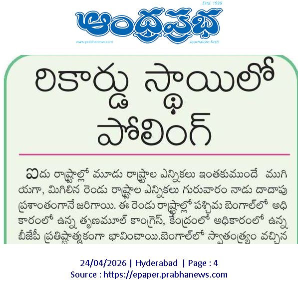 24thaprileditorial | ఐదు రాష్ట్రాల ఎన్నికల్లో మూడు రాష్ట్రాల పోలింగ్ ఇప్పటికే ముగియగా, మిగిలిన రెండు రాష్ట్రాల్లో గురువారం జరిగిన పోలింగ్ దాదాపు ప్రశాంతంగా కొనసాగింది. ఈ రెండు రాష్ట్రాల్లో పశ్చిమ బెంగాల్‌లో అధికారంలో ఉన్న తృణమూల్ కాంగ్రెస్, కేంద్రంలో అధికారంలో ఉన్న బీజేపీ ఈ ఎన్నికలను ప్రతిష్టాత్మకంగా భావించాయి.