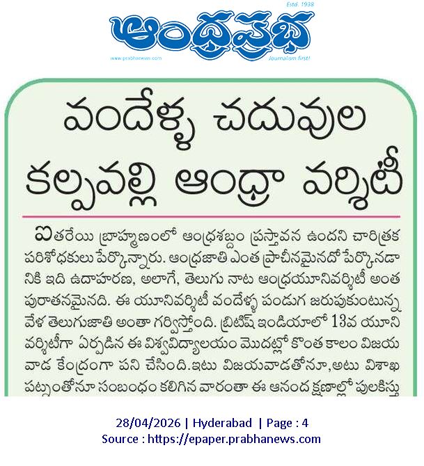 28thaprileditorial | ఐతరేయి బ్రాహ్మణంలో “ఆంధ్ర” శబ్దం ప్రస్తావన ఉందని చారిత్రక పరిశోధకులు పేర్కొన్నారు. ఆంధ్రజాతి ఎంత ప్రాచీనమైనదో చెప్పడానికి ఇది ఒక ఉదాహరణ. అలాగే తెలుగు నాట ఆంధ్ర యూనివర్శిటీ కూడా అంతే పురాతనమైనది. ఈ యూనివర్శిటీ వందేళ్ల పండుగ జరుపుకుంటున్న వేళ తెలుగుజాతి అంతా గర్విస్తోంది.
