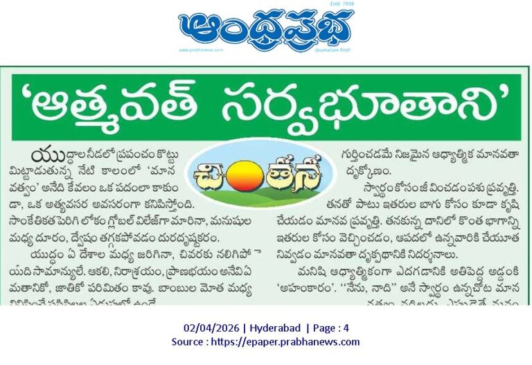 2ndAprilchintana | యుద్ధాల నీడలో ప్రపంచం కొట్టు మిట్టాడుతున్న నేటి కాలంలో ‘మానవత్వం’ అనేది కేవలం ఒక పదంలా కాకుండా, ఒక అత్యవసర అవసరంగా కనిపిస్తోంది. సాంకేతికత పెరిగి లోకం గ్లోబల్ విలేజ్ మారినా, మనుషుల మధ్య దూరం, ద్వేషం తగ్గకపోవడం దురదృష్టకరం. స్వార్థం కోసం జీవించడం పశు ప్రవృత్తి. తనతో పాటు ఇతరుల బాగు కోసం కృషి చేయడం మానవ ప్రవృత్తి. తనకున్న దానిలో కొంత భాగాన్ని ఇతరుల కోసం వెచ్చించడం, ఆపదలో ఉన్నవారికి చేయూత, యుద్ధం ఏ దేశాల మధ్య జరిగినా, చివరకు నలిగిపోనివ్వడం మానవతా దృక్పథానికి నిదర్శనాలు. ఆకలి, నిరాశ్రయం, ప్రాణభయం అనేవి ఏ మతానికో, జాతికో పరిమితం కావు. బాంబుల మోత మధ్య వినిపించే పసిపిల్లల ఏడుపులో ఉండే వేదన ప్రపంచ వ్యాప్తంగా ఒకటే. అక్కడ మానవత్వం అంటే గాయపడిన వారికి సాయం చేయడం, శరణార్థులకు నీడ ఇవ్వడం. ఆధ్యాత్మికత అంటే కేవలం పూజలు, పునస్కారాలు లేదా అడవులకు వెళ్లి తపస్సు చేయడం మాత్రమే కాదు. తోటి మనిషిలోని దైవత్వాన్ని గుర్తించి, ప్రేమతో సేవ చేయడమే నిజమైన ఆధ్యాత్మికత.
