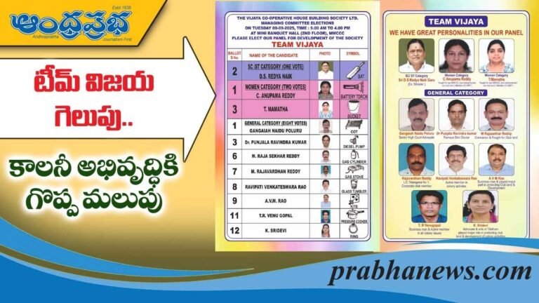 విజయా కోఆపరేటివ్ సొసైటీ ఎన్నికలు మంగళవారం 9 సెప్టెంబర్ 2025 ఉదయం 9గంటల నుండి సాయంత్రం 4 గంటల వరకు జరగనున్నాయి. ఈ ఎన్నికలలో తమ ప్యానెల్ ని అత్యధిక మెజారిటీతో గెలిపించ వలసిందిగా టీం విజయ ప్యానల్ వారు ఓటింగ్ లో పాల్గొంటున్న కాలనీవాసులందరినీ కోరుతున్నారు.