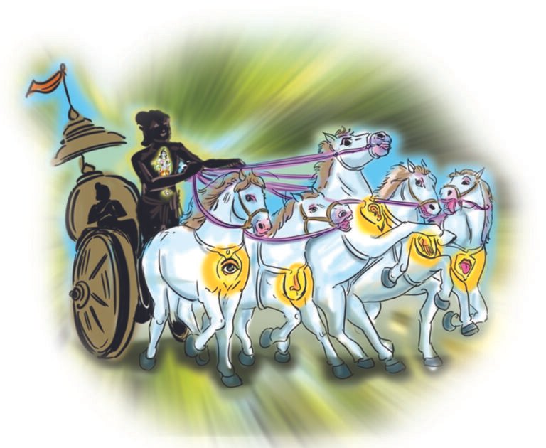 శరీరం అశాశ్వతమైనది. శాశ్వతమైనది ఆత్మ. శాశ్వతమైన ఆత్మ అశాశ్వతమైన శరీరంతో కలసి ప్రయాణం సాగించాలి. జీవనయానంలో రథికుడు జీవాత్మ. ఆత్మకు శరీరం రథంలాంటిది. రథాన్నిలాగే గుఱ్ఱాలు పంచేంద్రియాలు. సాధారణంగా గుఱ్ఱాల మధ్య సమన్వయం కుదరదు. ఔను, కాదనే విచికిత్సలో ఊగిసలాడడం సంకల్ప వికల్పాలుగా చెప్పుకోవచ్చు. ఒకటొకవైపు లాగితే మరొకటి మరొకవైపు లాగే ఈ సంకల్పవికల్పాలకు ప్రతీకయైన మనసనేది గుఱ్ఱాలకు వేసే కళ్ళెము. రథానికి సారథి బుద్ధి. రథికుని మార్గనిర్దేశనంలో సారథి గుఱ్ఱాలను సమన్వయపరచి, నియంత్రించి లక్ష్యంవైపు నడిపించాలి. రథికుడు ప్రమత్తుడైతే సారథిలో విచక్షణ స్థానంలో నిర్లిప్తత చోటుచేసుకుంటుంది. సారథి వివేక రహితుడైతే కళ్ళానికి విలువలేదు. మనసు సంయమనతను కోల్పోతే, ఇంద్రియాలు తమ ఇఛ్ఛమేరకు పరుగులు తీస్తాయి. సారథికి నైపుణ్యం లేకపోయినా గుఱ్ఱాలు సారథిని లెక్కచేయవు. నిరంతర చైతన్యశీలియైన ఆత్మ ప్రయాణాన్ని రథం నడకతో పోలుస్తున్నాడు… కఠోపనిషత్తులో యముడు.
