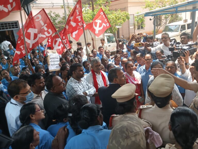 ఆంధ్రప్రభ, విజయవాడ : విజయవాడ ప్రభుత్వ ఆసుపత్రిలో శానిటేషన్ కార్మికుల సమ్మె ఉద్రిక్త పరిస్థితులకు దారితీసింది. మూడు నెలలుగా వేతనాలు చెల్లించకపోవడంపై ఆగ్రహంతో కార్మికులు సమ్మె శిబిరం నుండి ఆసుపత్రి సూపరింటెండెంట్ను కలిసేందుకు వెళ్లేందుకు ప్రయత్నించగా, పోలీసులు అనుమతి లేదంటూ అడ్డుకున్నారు. దీంతో కార్మికులు అక్కడికక్కడే భీష్మించుకుని కూర్చొని నిరసన కొనసాగించారు.