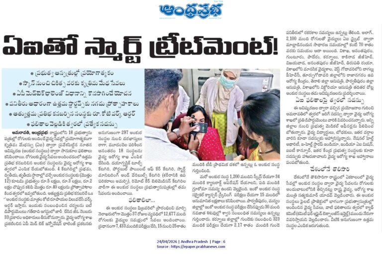 పార్వతీపురం మన్యం జిల్లాలో 30 మంది నవజాత శిశువుల్లో శ్వాస సంబంధిత సమస్యలు గుర్తించారు. కర్నూలు జిల్లాలో 323 మందికి గుండె పరీక్షలు చేయగా 2.17 శాతం మందిలో గుండె పనితీరులో సమస్యలు ఉన్నట్లు తేలింది. అలాగే 2,100 మంది రోగులతో వైద్యులు ఏఐ స్క్రైబ్ ద్వారా మాట్లాడటంతో సాధారణ సమయంతో పోలిస్తే 70 శాతం సమయం ఆదా అయింది.