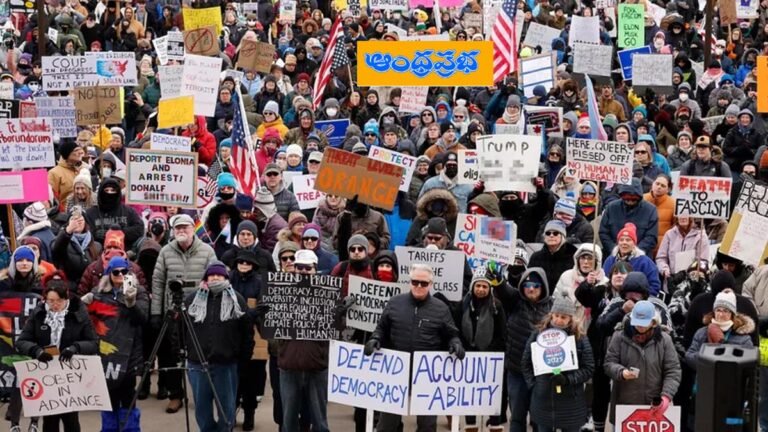 వాషింగ్టన్ – అమెరికాను మరోసారి గొప్ప దేశంగా మారుస్తానంటూ రెండోసారి అధికారంలోకి వచ్చిన అధ్యక్షుడు డొనాల్డ్ ట్రంప్కు వ్యతిరేకంగా నిరసనలు ఊపందుకుంటున్నాయి. ఆయన తీసుకుంటున్న నిర్ణయాలు, అమలు చేస్తున్న విధానాలు అమెరికన్లకు ఎంతమాత్రం నచ్చడం లేదు. ట్రంప్ తీరును మెజార్టీ జనం తప్పుపడుతున్నారు. అమెరికాను నాశనం చేయొద్దని కోరుతున్నారు. అమెరికాలో రాచరికం లేదు, ట్రంప్ రాజు కాదు అంటూ జనం గొంతెత్తి నినదిస్తుండడం గమనార్హం. ట్రంప్కు వ్యతిరేకంగా ఆదివారం దేశవ్యాప్తంగా నిరసన కార్యక్రమాలు జరిగాయి. జనం వీధుల్లోకి వచ్చి అధ్యక్షుడికి వ్యతిరేకంగా గొంతు విప్పారు. ప్లకార్డులు ప్రదర్శించారు. వైట్హౌస్ ఎదుట, టెస్లా కార్యాలయాల వద్ద, నగరాల్లోని ప్రధాన సెంటర్లలో జనం పెద్ద ఎత్తున గుమికూడారు. ట్రంప్ వ్యవహార శైలిపై ఆగ్రహం వెళ్లగక్కారు. చాలాచోట్ల ర్యాలీలు జరిగా యి. ఈ నిరసన ఉద్యమం 50501 గా పేరు పొందింది. ;50 నిరసనలు, 50 రాష్ట్రాలు, ఒక ఉద్యమం అనేదే దీని అర్థం. సరిగ్గా 250 ఏళ్ల క్రితం అమె రికాలో ఇదే రోజు విప్లవ యుద్ధం ఆరంభమైంది.