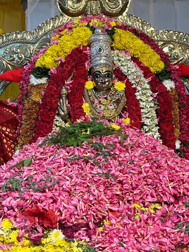 మూడవ రోజు చామంతి–గులాబీ పూలతో కనకదుర్గమ్మకు అద్భుత అలంకరణ