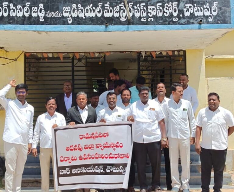 చౌటుప్పల్, ఆంధ్రప్రభ : యాదాద్రి భువనగిరి జిల్లాలో రెండవ డివిజన్ కేంద్రమైన చౌటుప్పల్ మున్సిపాలిటీ కేంద్రం లో అదనపు జిల్లా న్యాయస్థానం ఏర్పాటు చేయాలని కోరుతూ చౌటుప్పల్ బార అసోసియేషన్ ఆధ్వర్యంలో బుధవారం చౌటుప్పల్ కోర్టు ముందు న్యాయవాదులు ధర్నా చేశారు. ఈ సందర్భంగా బార్ సోసియేషన్ అధ్యక్షులు తాడూరి పరమేష్ మాట్లాడుతూ చౌటుప్పల్ పట్టణం జాతీయ రహదారిపై ఉన్నందున అదనపు జిల్లా న్యాయస్థానం ను చౌటుప్పల్ పట్టణంలో ఏర్పాటు చేయడం వల్ల కక్షిదారులకు, న్యాయవాదులకు, అధికారులకు సౌకర్యంగా ఉంటుందని తెలిపినారు.