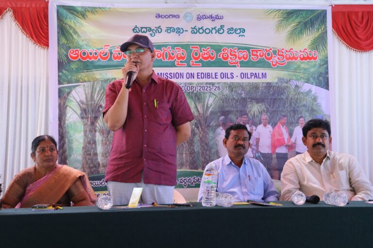 వరంగల్ జిల్లా ఆయిల్ ఫామ్ పంటకు అనుకూలమైన నేలలు, అత్యధిక దిగుబడిని ఇచ్చే పంట భూములు, ఒక చెట్టుకు 25 గెలలు వస్తున్నాయి అని అన్నారు. సాఫ్ట్వేర్ ఇంజనీర్ కంటే నెల నెల ఆయిల్ పామ్ ద్వారా రైతుకు ఎక్కువ జీతం వచ్చే విధంగా ఆయిల్ పామ్ దిగుబడిని ఇస్తుందని ఈ సందర్భంగా రైతులకు సూచించారు. రైతులు 12 వేల ఎకరాలు ఆయిల్ ఫామ్ సాగు చేసినట్లయితే ఫ్యాక్టరీ కట్టిస్తామని రైతులకు హామీ ఇచ్చారు. తక్కలపెళ్లి సత్యనారాయణ రావు మాట్లాడుతూ… సంవత్సరాల తరబడి వ్యవసాయం చేసి పెట్టుబడులు రాక అప్పలపాలు అయ్యి. ఆయిల్ పామ్ ఎంచుకోవడం జరిగింది. సేంద్రియ వ్యవసాయం, ఆవు దూడ ద్వారా, గో మూత్రం ద్వారా ఆయిల్ పామ్ సాగు చేయడం జరుగుతుందని అన్నారు.