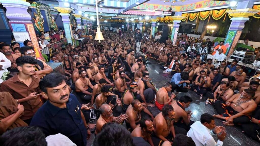 కరీంనగర్, ఆంధ్రప్రభ : అయ్యప్ప స్వామి మహా పడిపూజోత్సవం అత్యంత వైభవంగా నిర్వహించారు. శనివారం రాత్రి కరీంనగర్ నగరంలోని మహాశక్తి ఆలయంలో నిర్వహించిన పడిపూజోత్సవ కార్యక్రమానికి కేంద్ర హోంశాఖ సహాయ మంత్రి బండి సంజయ్ కుమార్ హాజరై ప్రత్యేక పూజలు నిర్వహించారు. అయ్యప్ప మాలదారుల భజనలతో మహాశక్తి ఆలయం మారుమోగిపోయింది. వేద పండితుల మంత్రోచ్ఛరణల మధ్య పడిపూజోత్సవం ఘనంగా నిర్వహించారు. అయ్యప్ప మాలదారులతో పాటు పెద్ద సంఖ్యలు భక్తులు పాల్గొన్నారు.