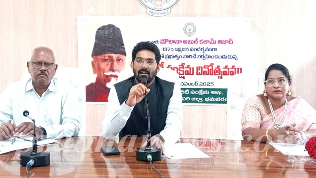 భీమవరం, ఆంధ్రప్రభ బ్యూరో: భారతదేశ విద్యావ్యవస్థకు పునాదులు వేసిన మహనీయుడు మౌలానా అబుల్ కలాం ఆజాద్ అని జిల్లా జాయింట్ కలెక్టర్ టి.రాహుల్ కుమార్ రెడ్డి (T. Rahul Kumar Reddy) అన్నారు. మంగళవారం జిల్లా మైనార్టీ శాఖ ఆధ్వర్యంలో జాతీయ విద్యా దినోత్సవం, మైనార్టీల సంక్షేమ దినోత్సవం కార్యక్రమం నిర్వహించారు. స్వాతంత్ర సమరయోధుడు, భారతదేశం తొలి విద్యాశాఖ మంత్రి మౌలానా అబుల్ కలాం ఆజాద్ 137 జయంతి కార్యక్రమంను జిల్లా కలెక్టరేట్ వశిష్ట కాన్ఫరెన్స్ సమావేశ మందిరంలో ఘనంగా నిర్వహించారు. ఈ కార్యక్రమానికి ముఖ్యఅతిథిగా జిల్లా జాయింట్ కలెక్టర్ టి.రాహుల్ కుమార్ రెడ్డి పాల్గొని మౌలానా అబుల్ కలం ఆజాద్ చిత్రపటానికి పూలమాలలు వేసి ఘనంగా నివాళులర్పించారు.