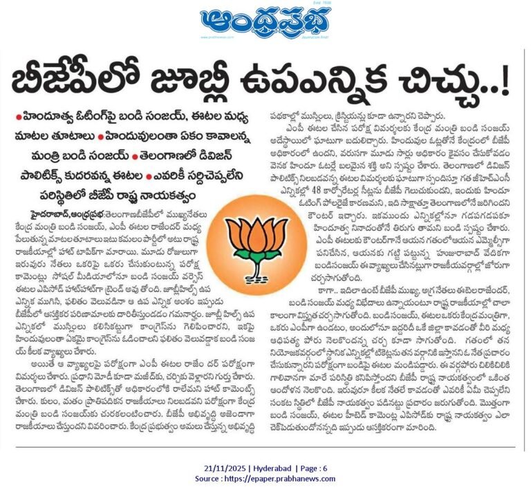 Bandi Vs Etela, హైదరాబాద్, ఆంధ్రప్రభ : తెలంగాణ (Telangana) బీజేపీలో ముఖ్యనేతలు బండి సంజయ్, ఎంపీ ఈటల రాజేందర్ మధ్య పేలుతున్న మాటల తూటాలు ఇటు కమలం పార్టీలో అటు రాష్ట్ర రాజకీయాల్లో హాట్ టాపిక్ గా మారాయి. మూడు రోజులుగా ఇరువురు నేతలు ఒకరి పై ఒకరు చేసుకుంటున్న పరోక్ష కామెంట్లు సోషల్ మీడియాలోనూ బండి సంజయ్ వెర్సెస్ ఈటల ఎపిసోడ్ హాట్ హాట్ గా ట్రెండ్ అవుతోంది. జూబ్లీహిల్స్ ఉప ఎన్నిక ముగిసి ఫలితం వెలువడినా ఆ ఉప ఎన్నిక అంశం ఇప్పుడు బీజేపీలో ఆసక్తికర పరిణామాలకు దారి తీస్తుండడం గమన్హారం.
