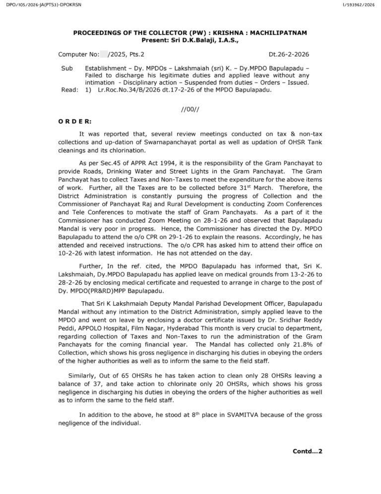 బాపులపాడు, ఆంధ్రప్రభ : విధులలో నిర్లక్ష్యంగా వ్యవహరించిన కృష్ణాజిల్లా బాపులపాడు డిప్యూటీ ఎంపీడీవో లక్ష్మయ్యను విధులు నుండి సస్పెండ్ చేస్తూ జిల్లా పంచాయతీ అధికారి డాక్టర్ జె.అరుణ గురువారం సాయంత్రం ఉత్తర్వులు జారీ చేశారు. పన్నులు, నాన్-పన్నుల వసూళ్లలో కేవలం 21.8% మాత్రమే పురోగతి సాధించడం శాఖపరమైన సమీక్షా సమావేశాలకు గైర్హాజరు అవ్వడమే కాకుండా ప్రజలకు తాగునీరు అందించే ఓహెచ్ఎస్ఆర్ ట్యాంకుల శుభ్రపరచడం, క్లోరినేషన్ పనుల్లో కూడా తీవ్ర నిర్లక్ష్యంగా వ్యవహరించినట్లు గుర్తించడంతో జిల్లా కలక్టర్ డీకే బాలాజీ ఆదేశాల మేరకు సస్పెండ్ చేయడం జరిగిందన్నారు. ప్రజల శ్రేయస్సు దృష్ట్యా తదుపరి విచారణ పూర్తయ్యే వరకు ఈ సస్పెన్షన్ అమల్లో ఉంటుందన్నారు.