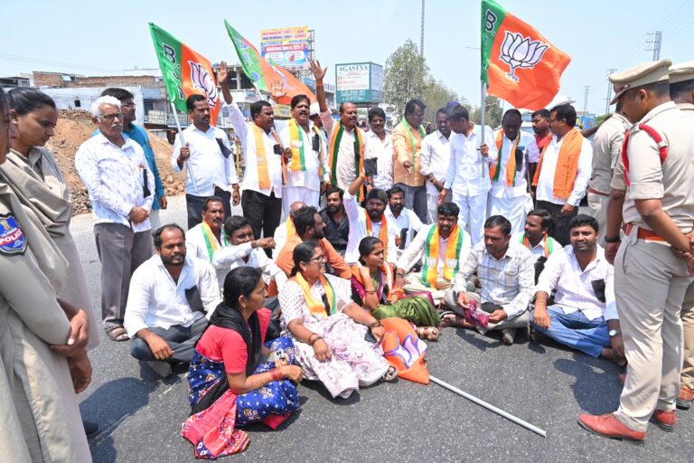 చౌటుప్పల్, ఆంధ్రప్రభ : కాంగ్రెస్ పార్టీ మహిళా వ్యతిరేక పార్టీ అని చౌటుప్పల్ మండల బీజేపీ అధ్యక్షులు కైరంకొండ అశోక్ ఆరోపించారు. పార్లమెంట్ లో ప్రధాని నరేంద్ర మోడీ నాయకత్వంలోని ఎన్డీఏ ప్రభుత్వం ప్రవేశపెట్టిన మహిళలకు 33శాతం రిజర్వేషన్ల బిల్లును కాంగ్రెస్ పార్టీ అడ్డుకోవడాన్ని నిరసిస్తూ బీజేపీ మండల పార్టీ అధ్యక్షుడు కైరంకొండ అశోక్ ఆధ్వర్యంలో చౌటుప్పల్ పట్టణంలోని జాతీయ రహదారి పై పెద్ద ఎత్తున నాయకులు, కార్యకర్తలు బైఠాయించి నల్ల బ్యాడ్జీలతో నిరసన ప్రదర్శన చేశారు.