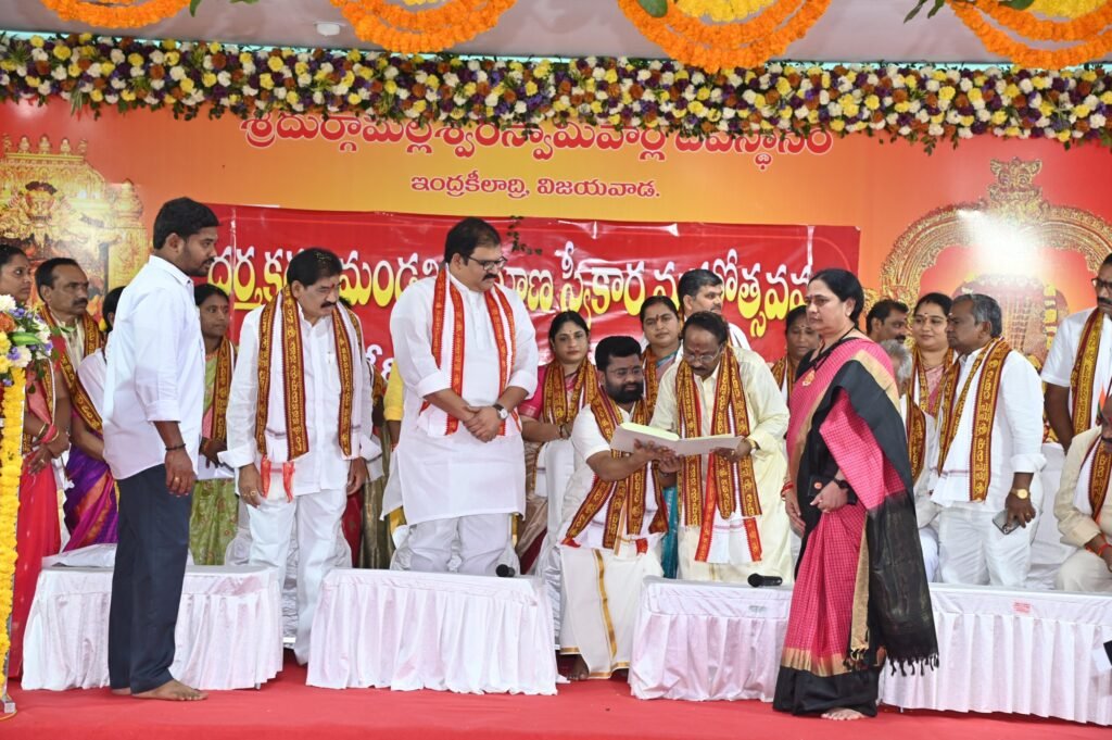 ఆంధ్రప్రభ, ఎన్టీఆర్ బ్యూరో : విజయవాడలోని ఇంద్రకీలాద్రిపై ఉన్న శ్రీ దుర్గా మల్లేశ్వర స్వామి వార్ల దేవస్థానం నూతన పాలకమండలి ప్రమాణస్వీకారం ఆర్భాటంగా నిర్వహించారు. కూటమి ప్రభుత్వం అధికారంలోకి వచ్చి 16 నెలలు దాటిన తర్వాత నూతన పాలకమండలిని ఇటీవల ప్రకటించింది.
