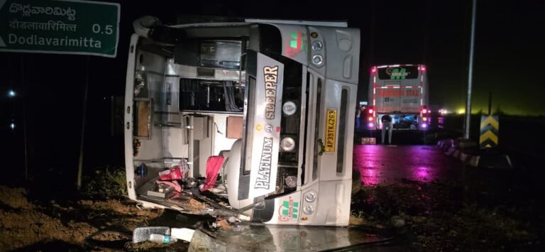 - దొడ్లవారిమిట్ట వద్ద ప్రైవేట్ ట్రావెల్స్ బస్సు బోల్తా..
