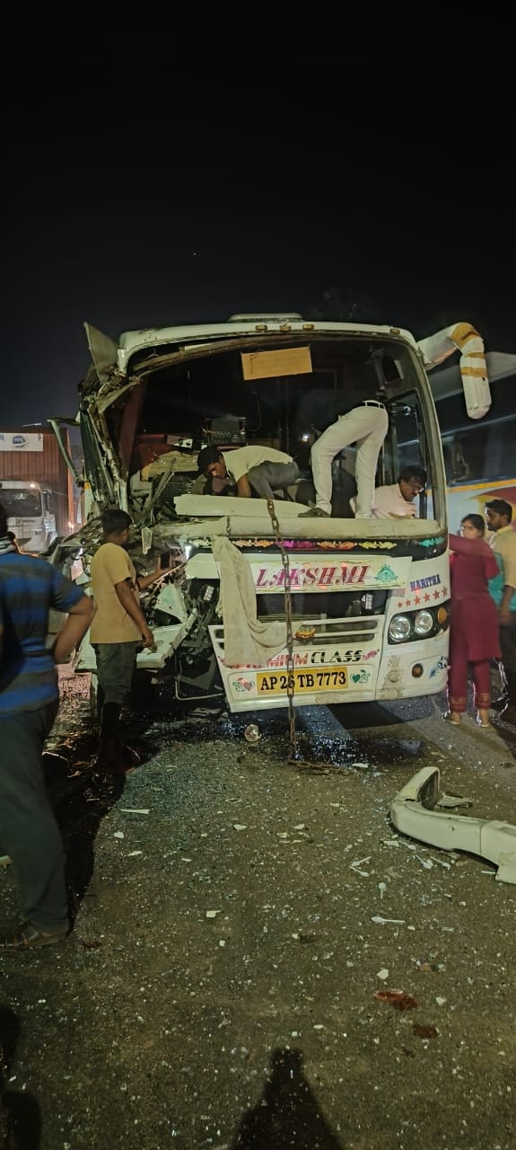 Bus Accident, గన్నవరం, ఆంధ్రప్రభ : కృష్ణాజిల్లా గన్నవరం (Gannavaram) మండలం చిన్న అవుటపల్లి వద్ద ఆదివారం అర్ధరాత్రి జరిగిన రోడ్డు ప్రమాదంలో యూటర్న్ తీసుకుంటున్న లారీనీ బస్సు ఢీకొంది. వివరాలు ఇలా ఉన్నాయి. నంద్యాల జిల్లాకు చెందిన పెళ్లి బృందం శ్రీకాకుళంలో పెళ్లికి వెళ్లి తిరిగి వస్తున్నారు. ఈ క్రమంలో గన్నవరం మండలం చిన్న అవుటపల్లి మిశ్రా హోటల్ సమీపంలో కెమికల్ పౌడర్ లోడుతో హనుమాన్ జంక్షన్ నుంచి వస్తున్న ఓ లారీ హైదరాబాద్ వెళ్లేందుకు యూ టర్న్ తీసుకుంటుంది. అదే సమయంలో విజయవాడ వెళ్తున్న పెళ్లి బృందం బస్సు లారీని బలంగా ఢీకొట్టింది. అదే సమయంలో వెనక వస్తున్నా కారు బస్సును బలంగా ఢీకొంది.