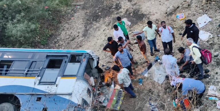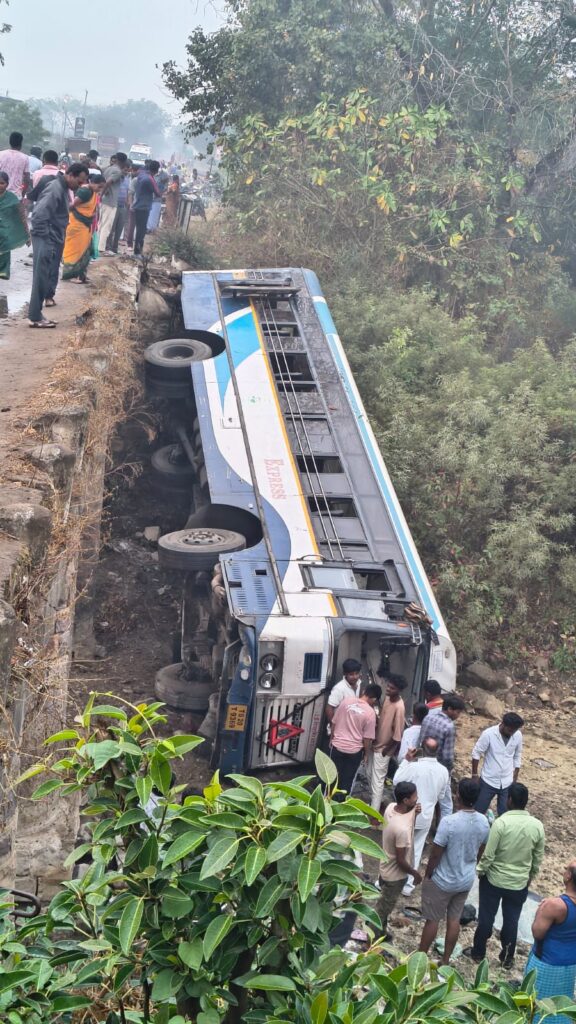 Bus accident, ఉట్నూర్, ఆంధ్రప్రభ : ఆదిలాబాద్ జిల్లా ఉట్నూరు మండలంలోని షాంపూర్ లో సోమవారం తెల్లవారుజామున వంతెన పై నుండి వాగులో ఆర్టీసీ బస్సు అదుపుతప్పి బోల్తా పడింది. ఈ చిన్న వాగులో నీరు లేకపోవడం వల్ల అధిక ఎత్తు లేకపోవడం వల్ల పెను ప్రమాదం తప్పింది. ఆ బస్సులో ప్రయాణిస్తున్న 20 మందికి పైగా ప్రయాణికులకు గాయాలు అయ్యాయి. బస్సు బోల్తా పడ్డ విషయం తెలియగానే షాంపూర్ గ్రామస్తులు వచ్చి బస్సు అద్దాలు పగలగొట్టి గాయాలైన ప్రయాణికులను బస్సు నుండి బయటకు తీశారు.
