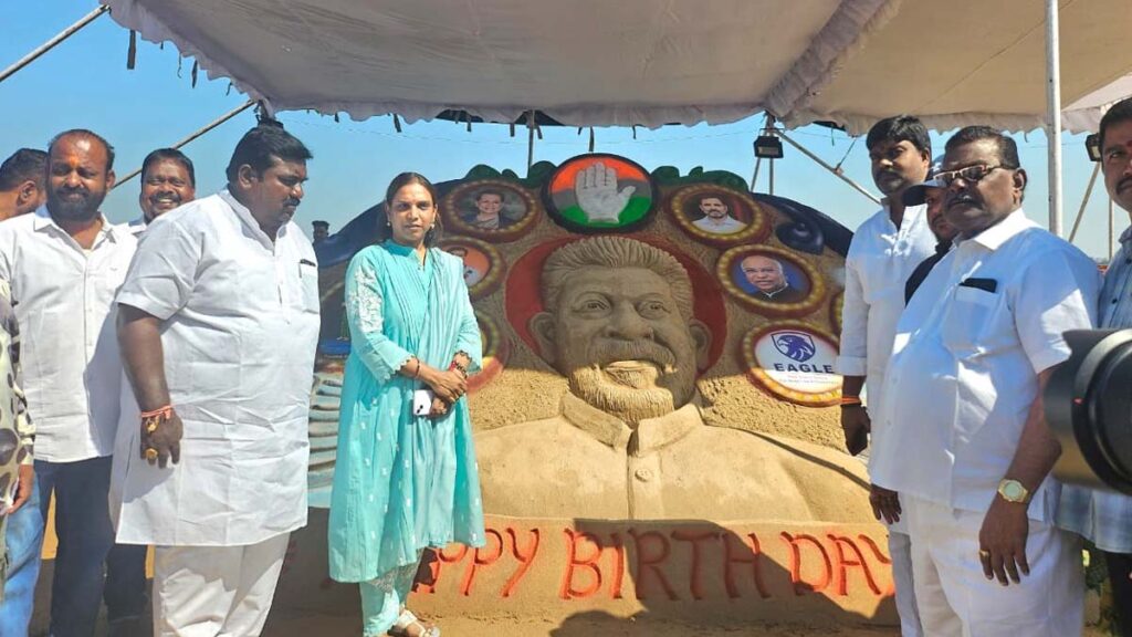 ఈ సందర్భంగా శిల్పి బాలాజీ రూపొందించిన సైకత శిల్పం ఆకర్షణగా నిలిచింది. కాంగ్రెస్ పార్టీ ముఖ్య నాయకులు, కార్యకర్తలు పెద్ద సంఖ్యలో హాజరై వేడుకలను సందడిగా నిర్వహించారు.