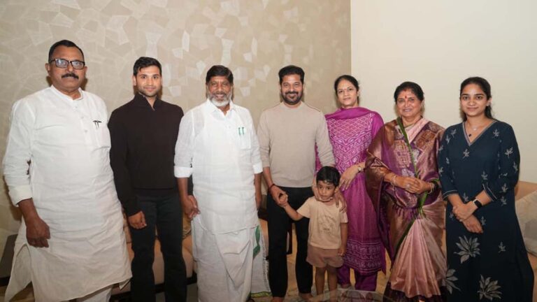 ఆదివారం సీఎం రేవంత్ రెడ్డి, గీతా రెడ్డి దంపతులను జూబ్లీహిల్స్లోని వారి నివాసంలో భట్టి విక్రమార్క కుటుంబ సభ్యులు మర్యాదపూర్వకంగా కలిసి ఆహ్వాన పత్రం అందజేశారు.
