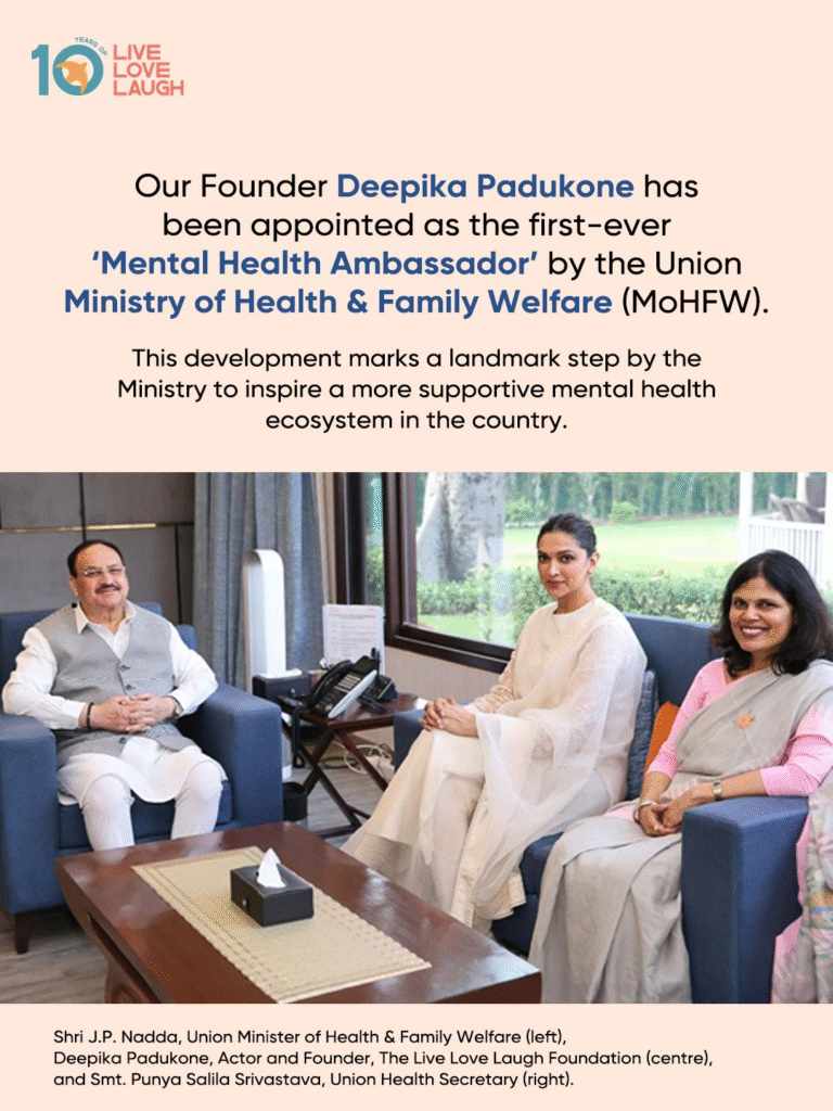 ఈ నియామకాన్ని కేంద్ర ఆరోగ్య & కుటుంబ సంక్షేమ మంత్రిత్వ శాఖ ప్రకటించింది. మానసిక ఆరోగ్యం గురించి సమాజంలో అవగాహన పెంచడం, చర్చలు జరపడంలో దీపిక నియామకం ఒక ప్రధాన ముందడుగుగా భావిస్తున్నారు.