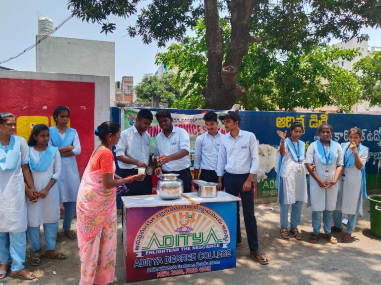 పాయకాపురం, ఆంధ్రప్రభ : స్థానిక పైపుల రోడ్డు, సింగ్ నగర్లో గల ఆదిత్య డిగ్రీ కళాశాల ఎన్.ఎస్.ఎస్ విద్యార్థులచే ఉచితంగా వాహనచోదకులకు, పాదచారులకు ఆదివారం మజ్జిగ పంపిణీ కార్యక్రమం నిర్వహించారు. ఈ సందర్భంగా ఆదిత్య డిగ్రీ కళాశాల ప్రిన్సిపాల్ జగదీశ్వరి పాల్గొని మాట్లాడుతూ పెరుగుతున్న ఎండలకు ప్రజలు తగు జాగ్రత్తలు తీసుకోవాలని సూచించారు.