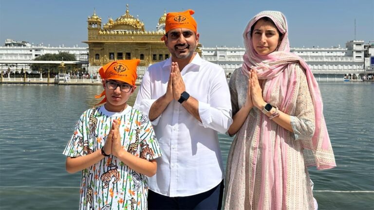 అమృత్సర్, : అమృత్సర్లోని స్వర్ణ దేవాలయాన్ని ఏపీ మంత్రి నారా లోకేష్ కుటుంబ సమేతంగా దర్శించుకున్నారు. భార్య బ్రాహ్మణి, కుమారుడు దేవాన్ష్లతో కలిసి పవిత్ర శ్రీహరి మందిర్ సాహిబ్ను సందర్శించారు. అనంతరం మంత్రి నారా లోకేష్ మాట్లాడుతూ.. పంజాబ్ లోని అమృత్సర్లోని స్వర్ణ దేవాలయాన్ని సందర్శించి.. అందరూ సుఖశాంతులతో, ఆయురారోగ్యాలతో ఆనందంగా ఉండాలని ప్రార్థించానని చెప్పారు. స్వర్ణ దేవాలయం సందర్శన మహా భాగ్యమని తెలిపారు. స్వర్ణ దేవాలయం ఆవరణలో గడిపిన సమయం ఆధ్యాత్మిక ప్రశాంతతను చేకూర్చిందన్నారు.
