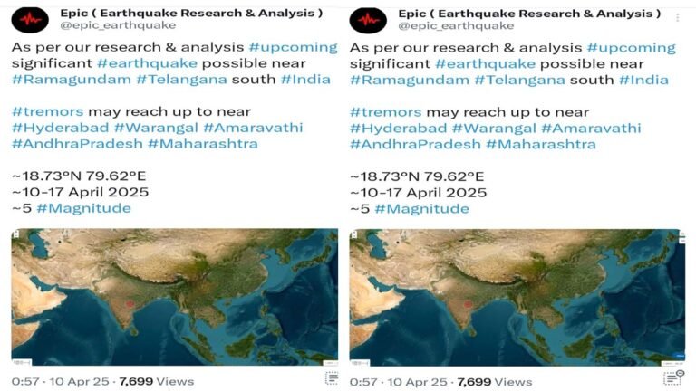 పెద్దపల్లి, ఆంధ్రప్రభ : తెలంగాణకు భూకంప హెచ్చరిక ప్రజలను భయాందోళనకు గురిచేస్తోంది. ఈనెల 10వ తేదీ నుండి 17వ తేదీ లోపు రామగుండం పరిసర ప్రాంతంలో భూకంపం వచ్చే అవకాశం ఉందని నిపుణులు హెచ్చరిస్తున్నారు. భూకంప తీవ్రత ఎక్కువగా ఉంటుందని చెబుతున్నారు. భూకంప తీవ్రత హైదరాబాద్, వరంగల్ తో పాటు ఆంధ్రప్రదేశ్ లోని అమరావతి, మహారాష్ట్ర వరకు కూడా ఉంటుందని అంటున్నారు. ఈ విషయం సోషల్ మీడియాలో వైరల్ కావడంతో ప్రజలు ఆందోళన చెందుతున్నారు.