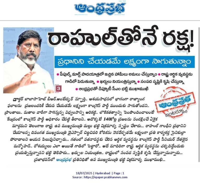 డాక్టర్ బాబాసా హెబ్ బీఆర్.అంబేద్కర్ స్ఫూర్తి.. ఆశయసాధనలో భాగంగా రాజ్యాంగ ఫలాలను ప్రజలందరికీ చేరువ చేయడమే లక్ష్యంగా కాంగ్రెస్ పార్టీ ముందుకు సాగుతోందని.. ప్రాంతాలు.. మతాల వారీగా సాగిస్తున్న విధ్వంసాన్ని అరికట్టి.. లౌకికతత్వాన్ని పెంపొందించాలంటే కేంద్రంలో కాంగ్రెస్ పార్టీ అధికారం చేపట్టి తీరాలని.. అదొక్కటే 140కోట్ల ప్రజలను సంరక్షించే ఏకైక మార్గమని తెలంగాణ రాష్ట్ర ఉప ముఖ్యమంత్రి మల్లు భట్టి విక్రమార్క స్పష్టం చేశారు… రాహుల్ గాంధీని ప్రధానిని చేయాలన్న దివంగత ముఖ్యమంత్రి వైఎస్సార్ చిట్టచివరి కోరికను నెరవేర్చడమే లక్ష్యంగా ప్రతి కార్యకర్త సైనికుల్లా పోరాడాలని ఆయన పిలుపునిచ్చారు… గతంలో పతనావస్థకు చేరిన ఆర్థిక వ్యవస్థను కాంగ్రెస్ పార్టీ సీనియర్ నేతలైన మన్మోహన్.. రోశయ్యలు ఎలా అయితే గాడిలో పెట్టారో.. అదే మాదిరిగా రాష్ట్ర ఆర్థిక వ్యవస్థను చక్కదిద్దేందుకు ప్రయత్నిస్తున్నానని భట్టి తెలిపారు… ఖర్చుల నియంత్రణ.. రాష్ట్రంలో సంపద సృష్టికి కృషి చేస్తున్నామన్నారు… ప్రజాభవన్లో ఆంధ్రప్రభ ప్రతినిధితో ఉప ముఖ్యమంత్రి భట్టి విక్రమార్క ముఖాముఖి.