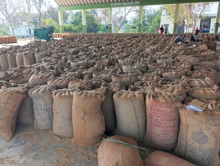 దేవుడు కనికరించినా పూజారి కనకరించలేదు అన్నట్టుగా.. తయారైంది నల్లగొండలో రైతుల పరిస్థితి. నల్లగొండ లారీల కాంట్రాక్టర్ల నిర్వాహకంతో జిల్లా కేంద్రంలోని ఎస్ఎల్బీసీ ధాన్యం కొనుగోలు కేంద్రంలో వేల బస్తాలు నిల్వ ఉన్నాయని రైతులు ఆవేదనకు గురవుతున్నారు. గత కొన్ని రోజుల నుండి వర్షం వల్ల రైతులు ఎన్నో ఇబ్బందులకు గురైయ్యారు. దీంతో జిల్లా కలెక్టర్ ఇలా త్రిపాటి ప్రతి రోజు ధాన్యం కొనుగోలు కేంద్రాలను తనిఖీలు చేస్తూ ఉన్నత అధికారులకు రైతులను ఇబ్బంది పెట్టొద్దని ధాన్యాన్ని వెంటనే కొనుగోలు చేసి మిల్లులకు తరలించాలి అన్నారు. లారీ కాంట్రాక్టర్లు స్పందించకపోవడంతో.. ధాన్యం కొనుగోలు కేంద్రాలలో వేసిన ధాన్యం నిల్వ ఉంటున్నాయి. వాతావరణం ఎప్పుడు ఏ విధంగా ఉంటుందో అనే భయంతో రైతులు ఆందోళనకు గురవుతున్నారు. ఉన్నతాధికారులు, కలెక్టర్ ఆదేశాలు పాటించి కొనుగోలు చేసిన ధాన్యాన్ని వెంటనే మిల్లులకు తరలించాలని రైతులు కోరుతున్నారు.