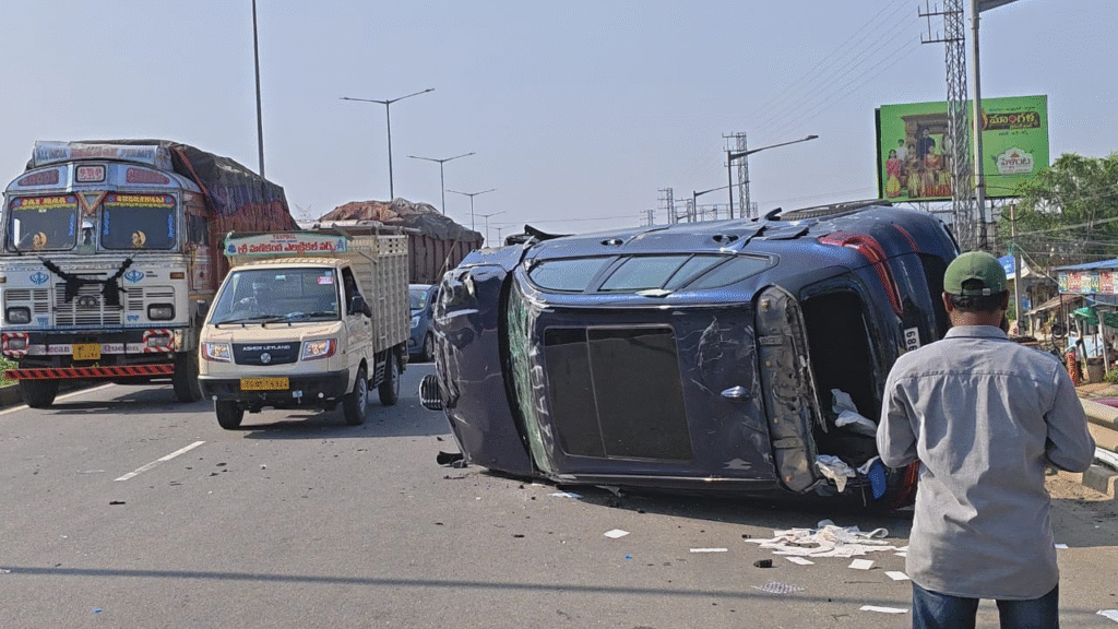 చౌటుప్పల్, ఆంధ్రప్రభ : చౌటుప్పల్ మండలంలోని కొయ్యలగూడెం గ్రామ బ్రిడ్జిపై ఈ రోజు సాయంత్రం ఘోర రోడ్డు ప్రమాదం జరిగింది. హైదరాబాద్(Hyderabad) నుంచి విజయవాడ వైపు వేగంగా వెళ్తున్న బీఎండబ్ల్యూ కారు(BMW car) అదుపుతప్పి ముందున్న లారీని వెనక నుండి ఢీకొట్టి కారు అదుపుతప్పి గాలిలో చెక్కర్లు కొడుతూ పక్కన వెళ్తున్న మరో స్విఫ్ట్ కారు(Swift car)పై పడింది.