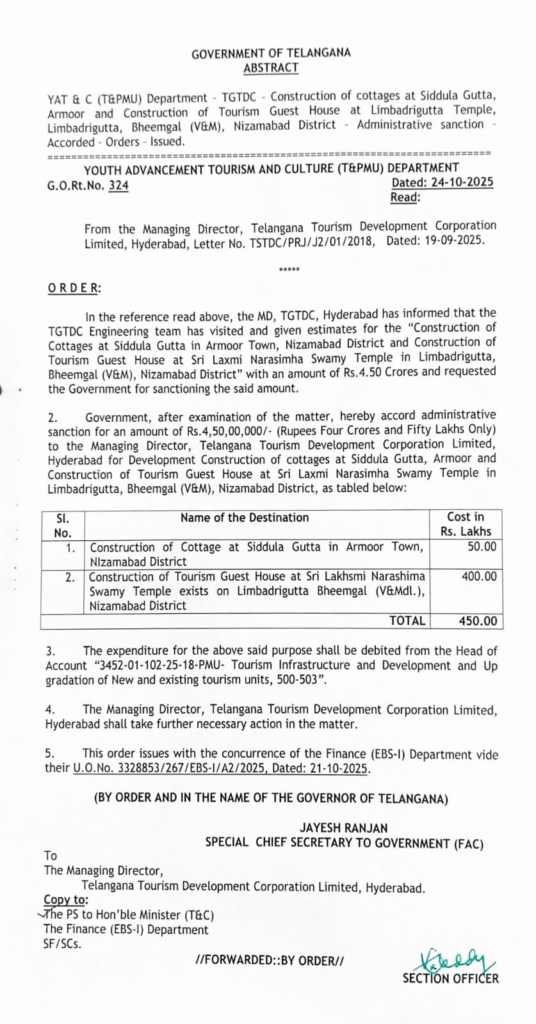 టూరిజం శాఖ నిధుల నుండి రూ.4 కోట్లు కేటాయిస్తూ గురువారం ఉత్తర్వులు జారీ అయ్యాయి. ఈ మేరకు ప్రభుత్వ ప్రత్యేక ప్రధాన కార్యదర్శి జయేష్ రంజన్ ఉత్తర్వులు జారీ చేసినట్లు సమాచారం.