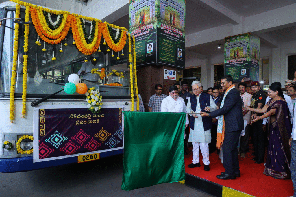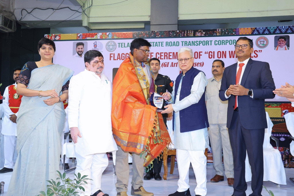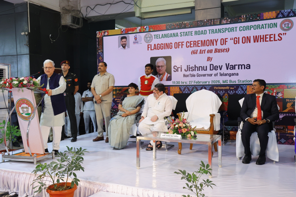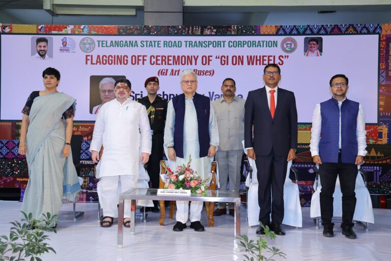 ఆంధ్రప్రభ, వెబ్ డెస్క్ః భౌగోళిక గుర్తింపు పొందిన తెలంగాణ సాంస్కృతిక కళావైభవాన్ని ప్రతిబంబించే హస్తకళలతో అలంకరించిన ప్రత్యేక బస్సులను రాష్ట్ర గవర్నర్ జిష్ణు దేవ్ వర్మ జెండా ఊపి ప్రారంభించారు. దేశంలోనే తొలిసారిగా “జీఐ ఆన్ వీల్స్” కార్యక్రమాన్ని శుక్రవారం హైదరాబాద్ లోని మహాత్మా గాంధీ బస్ స్టేషన్ (ఎంజీజీఎస్) లో జరిగిన కార్యక్రమంలో తెలంగాణ రాష్ట్ర గవర్నర్ జిష్ణు దేవ్ వర్మ ప్రారంభించారు. ఈ కార్యక్రమంలో రవాణా మరియు బీసీ సంక్షేమ శాఖ మంత్రివర్యులు పొన్నం ప్రభాకర్, టీజీఎస్ఆర్టీసీ వైస్ ఛైర్మన్ & మేనేజింగ్ డైరెక్టర్ నాగి రెడ్డి, హైదరాబాద్ జిల్లా కలెక్టర్ హరి చందన దాసరి పాల్గొన్నారు.