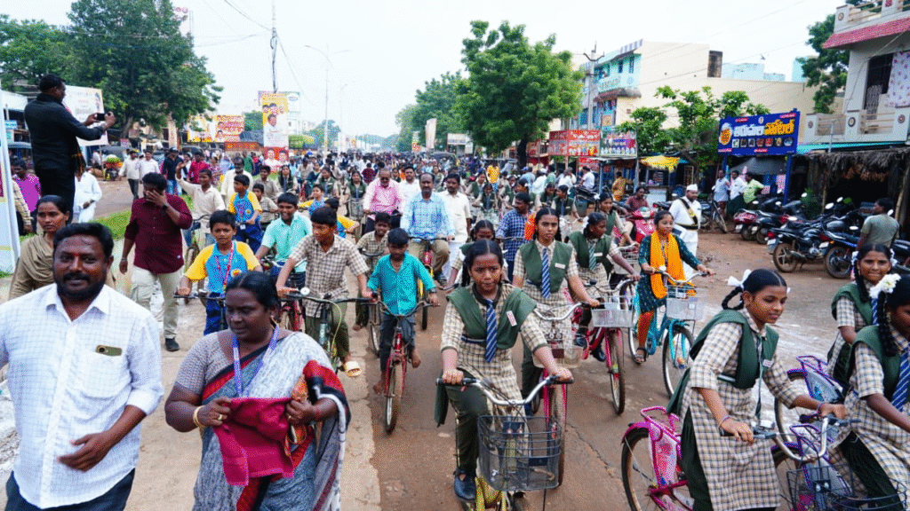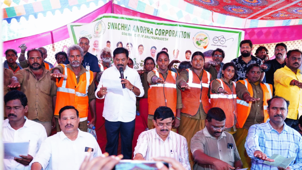 సింగరాయకొండ అక్టోబర్ 18 (ఆంధ్రప్రభ): పట్టణాలు, పల్లె సీమలు స్వచ్ఛంగా ఉంచే లక్ష్యంతో రాష్ట్ర ప్రభుత్వం నిర్వహిస్తున్న స్వర్ణ ఆంధ్ర – స్వచ్ఛ ఆంధ్ర కార్యక్రమంలో ప్రతి ఒక్కరూ భాగస్వాములు కావాలని రాష్ట్ర సాంఘిక సంక్షేమ శాఖ మంత్రి డా డోలా శ్రీ బాల వీరాంజనేయ స్వామి పిలుపునిచ్చారు. స్వర్ణ ఆంధ్ర – స్వచ్ఛ ఆంధ్ర కార్యక్రమంలో భాగంగా శనివారం సింగరాయకొండలో నిర్వహించిన స్వచ్ఛ కార్యక్రమంలో రాష్ట్ర మంత్రి డా డోలా శ్రీ బాల వీరాంజనేయ స్వామి పాల్గొన్నారు. ఈ సందర్భంగా పాకల రోడ్డు నుంచి కందుకూరు రోడ్డు వరకు నిర్వహించిన సైకిల్ ర్యాలీని మంత్రి జెండా ఊపి ప్రారంభించారు. మొక్కలు నాటారు.