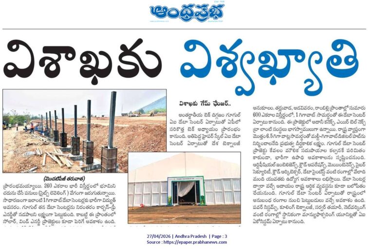 గూగుల్ ఏఐ డేటా సెంటర్ ఏర్పాటుతో ఆంధ్రప్రదేశ్లో సరికొత్త టెక్ అధ్యాయం ప్రారంభం కానుంది. అతిపెద్ద హైపర్ స్కేల్ ఏఐ డేటా సెంటర్తో దేశ టెక్నాలజీ రంగంలో కొత్త చరిత్ర సృష్టించనుంది. ఆసియా ఖండానికే కీలక ఏఐ గేట్వేగా విశాఖ అవతరించనుంది. అత్యాధునిక డేటా సెంటర్తో అంతర్జాతీయ టెక్ మ్యాప్లో విశాఖ శాశ్వత స్థానం సంపాదించనుంది. 15 బిలియన్ డాలర్ల పెట్టుబడితో, 1 గిగావాట్ సామర్థ్యంతో ఈ ప్రాజెక్టు దేశ చరిత్రలోనే అతిపెద్ద విదేశీ ప్రత్యక్ష పెట్టుబడిగా నిలవనుంది. త్వరలో సబ్సీ కేబుల్ వ్యవస్థ ద్వారా విశాఖకు అంతర్జాతీయ కనెక్టివిటీ మరింత బలోపేతం కానుంది. ఈ డేటా సెంటర్ ద్వారా భారీ డేటా నిల్వతో పాటు ఏఐ క్లౌడ్ మౌలిక సదుపాయాలు అందుబాటులోకి రానున్నాయి.