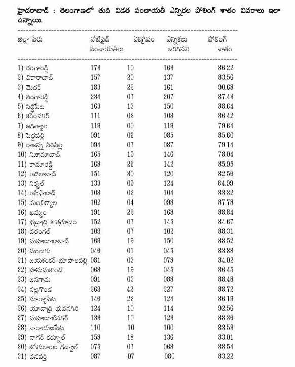 GP Election | తుది విడత పోలింగ్ శాతం ఇలా.. Pavan Chandragiri December 17, 2025 హైదరాబాద్ : తెలంగాణలో తుది విడత పంచాయతీ ఎన్నికల పోలింగ్ శాతం వివరాలు ఇలా ఉన్నాయి.