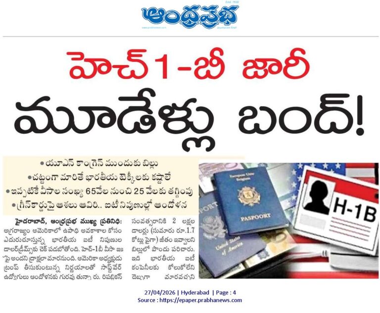 హైదరాబాద్, ఆంధ్రప్రభ : అగ్రరాజ్యం అమెరికాలో ఉపాధి అవకాశాల కోసం ఎదురుచూస్తున్న భారతీయ ఐటీ నిపుణుల డాలర్ కలకు చెక్ పడే పరిస్థితి ఏర్పడుతోంది. హెచ్-1బీ వీసా ఇప్పుడు అందని ద్రాక్షలా మారే సూచనలు కనిపిస్తున్నాయి. అమెరికా అధ్యక్షుడు డొనాల్డ్ ట్రంప్ తీసుకుంటున్న నిర్ణయాలతో సాఫ్ట్వేర్ ఉద్యోగులు ఆందోళనకు గురవుతున్నారు. రిపబ్లికన్ సభ్యులు అమెరికా కాంగ్రెస్లో “End H-1B Visa Abuse Act-2026” బిల్లును ప్రవేశపెట్టారు. ఈ బిల్లుకు ఆమోదం లభిస్తే మూడేళ్ల పాటు హెచ్-1బీ వీసాల జారీని నిలిపివేస్తారు. ఈ ప్రతిపాదన తీవ్ర చర్చకు దారితీసింది. ఈ బిల్లు చట్టంగా మారితే అమెరికాలో స్థిర నివాసం ఏర్పరుచుకోవాలనుకునే భారతీయ యువత ఆశలు దెబ్బతింటాయి.