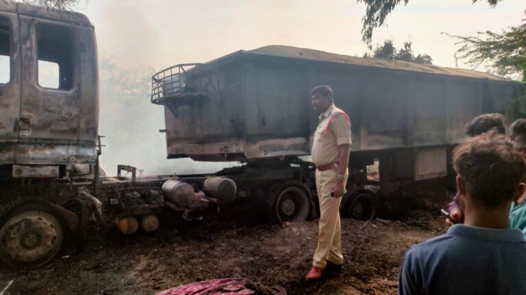 ఎదుటి లారీని తప్పించపోయి డ్రైవర్ తన కుడి వైపున పొలంలోకి లారీని పోనివ్వగా ,రోడ్డు పక్కన కరెంట్ ట్రాన్స్ ఫార్మర్ పోల్ ( Electrical Transformer) ని ఢీకొంది. విద్యుత్తు షార్ట్ సర్క్యూట్ తో ( Short Cicuit) లారీ ఇంజన్ భాగంలో మంటలు రేగాయి. ఇంజన్ ఎదుటి టైర్లు, మధ్యలోని 10 టైర్లు ( 10 Tires Fired) కాలిపోయాయి. ఈ ఘటనలో ప్రాణనష్టం జరగలేదు.ఈ ప్రమాదంలో బోయ రంగన్నకు చెందిన వరి గడ్డి (paddy geass), వేరు శెనగ పోట్టు, జొన్న సొప్ప వాము దొడ్డిలోకి మంటలతో లారీ దూసుకు రావటంతో అగ్నిప్రమాదం జరిగింది.