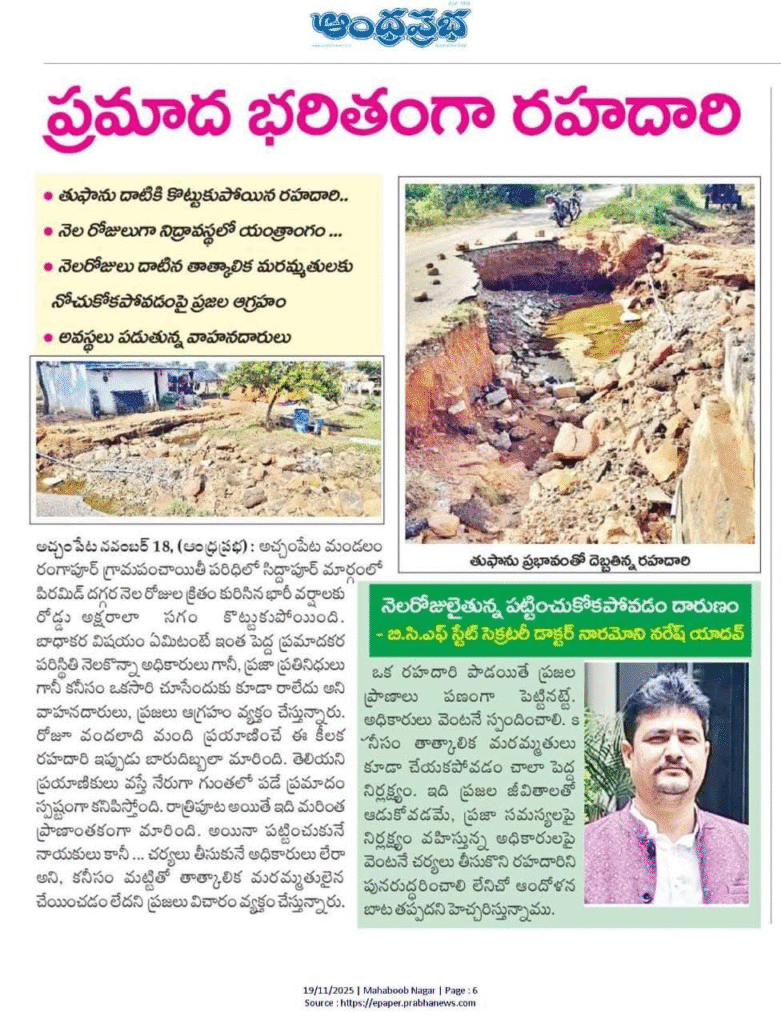 Article | అచ్చంపేట, (ఆంధ్రప్రభ) : అచ్చంపేట మండలం, రంగాపురం నుండి శ్రీశైలం వెళ్లే రహదారి ప్రమాద భరితంగా మారిపోయిందని ఆంధ్రప్రభ నవంబర్ 19న వెల్లడించిన కథనానికి అధికారులు వెంటనే స్పందించారు. గత నెల రోజుల క్రితం కురిసిన భారీ వర్షాల ప్రభావంతో రహదారి పెద్దఎత్తున కొట్టుకుపోయి ప్రయాణికులు, వాహనదారులు తీవ్ర ఇబ్బందులు పడుతున్న విషయం ఆంధ్రప్రభ ప్రత్యేక కథనం ద్వారా వెలుగులోకి వచ్చింది.