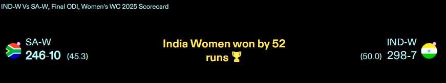 మొదట బ్యాటింగ్ చేసిన భారత్ 50 ఓవర్లలో 298 పరుగులు చేసింది. ప్రపంచకప్ ఫైనల్లో భారత్ తరఫున (పురుషులు, మహిళలు కలిపి) ఇదే అత్యధిక స్కోర్ కావడం విశేషం. బ్యాటింగ్లో సత్తా చాటిన హర్మన్ సేన బౌలింగ్లోనూ అదరగొట్టింది. ప్రత్యర్థి బ్యాటర్లను వరుసగా ఔట్ చేస్తూ సఫారీలకు షాక్ ఇచ్చింది.