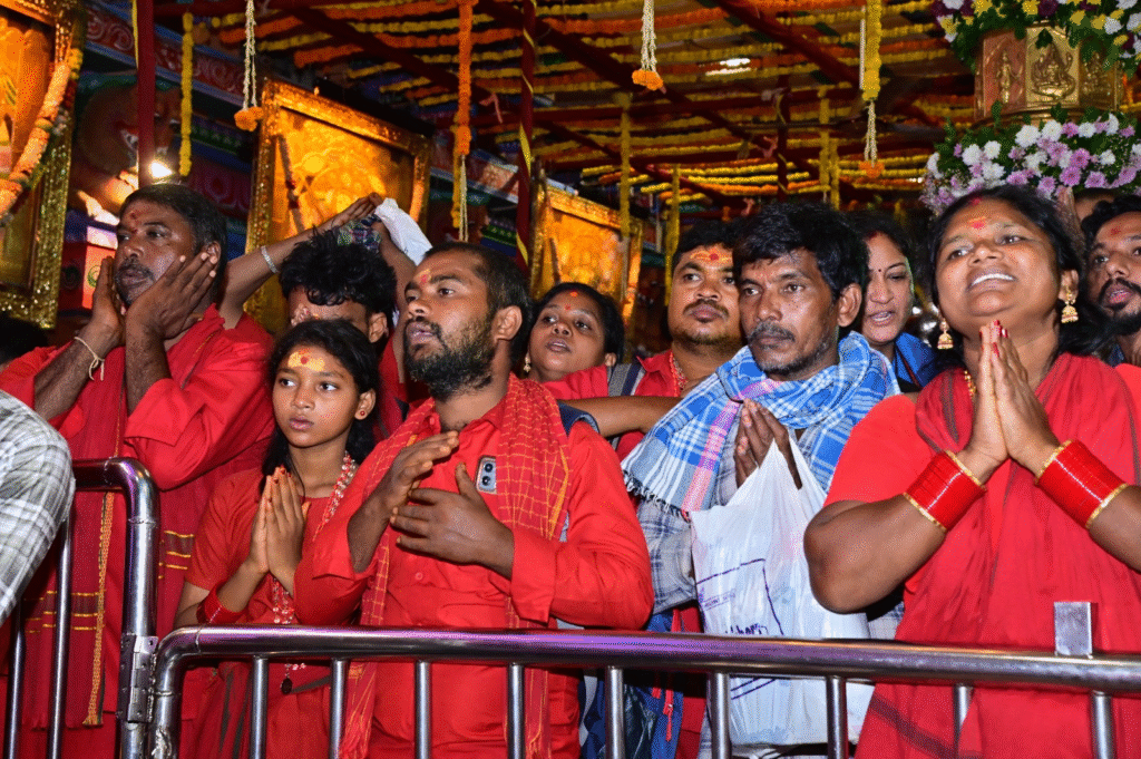 ఎన్టీఆర్ బ్యూరో, ఆంధ్రప్రభ : జై భవాని… జై జై దుర్గా భవాని… నామస్మరణతో ఇంద్రగిరలు(Indragiral) పులకరిస్తున్నాయి. రాష్ట్రం నలుమూలల నుంచి భారీ సంఖ్యలో తరలివస్తున్నభవానీBhavani)ల రాకతో ఇంద్రకీలాద్రి ఇరుపెక్కుతోంది. అరుణ శోభితంగా మారిన ఇంద్రకీలాద్రి(Indrakiladri)పై అమ్మవారి శరణు ఘోష మార్మోగుతోంది. గంట గంటకు పెరుగుతున్నభవానీల రాకతో అన్నిక్యూలైన్లతో పాటు హోల్డింగ్ ఏరియాలో కూడా కిక్కిరిసి ఉన్నాయి. జగన్మాత దర్శనానికి సుమారు ఐదు గంటలకు పైగా సమయం పడుతున్నప్పటికీ భక్తిశ్రద్ధలతో అమ్మవారి దర్శనం కోసం క్యూలైన్లో ఎదురుచూస్తున్నభవానీలు అమ్మ నామస్మరణను జపిస్తున్నారు.