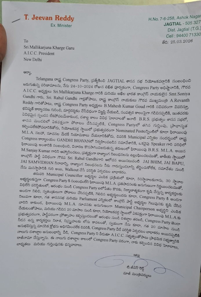 తన రాజీనామా నిర్ణయాన్ని అధికారికంగా ప్రకటిస్తూ జీవన్ రెడ్డి లేఖను విడుదల చేశారు. గత కొంతకాలంగా పార్టీలో చోటుచేసుకుంటున్న పరిణామాలపై అసంతృప్తితో ఈ నిర్ణయం తీసుకున్నట్లు ఆయన సంకేతాలు ఇచ్చారు. పార్టీతో నాలుగు దశాబ్దాల అనుబంధం ఉన్నప్పటికీ, ప్రస్తుత పరిస్థితుల్లో కొనసాగడం సాధ్యంకాదని భావించినట్లు తెలుస్తోంది. ఆయన రాజీనామా రాష్ట్ర కాంగ్రెస్లో కలకలం రేపింది. జీవన్ రెడ్డి తదుపరి రాజకీయ అడుగు ఏమిటన్నది ఆసక్తికరంగా మారింది. ఆయన ఇతర పార్టీల్లో చేరతారా లేదా కొత్త రాజకీయ మార్గాన్ని ఎంచుకుంటారా అన్నదానిపై చర్చలు సాగుతున్నాయి.