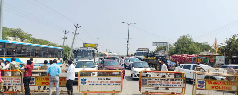 కృష్ణ ,ఆంధ్రప్రభ : కర్ణాటక రాష్ట్రంలో జరిగిన అసెంబ్లీ సమావేశాల్లో ఎస్సీ, ఎస్టీలకు తగిన బడ్జెట్ కేటాయించలేదని నిరసిస్తూ నేడు కర్ణాటక రాష్ట్రవ్యాప్తంగా భారీ ఎత్తున ధర్నాలు జరుగుతున్నాయి. ఈ నేపథ్యంలో కృష్ణ మండలం థైరోడ్ చెక్పోస్ట్ సరిహద్దుల వద్ద కర్ణాటక పోలీసులు భారీ బందోబస్తు ఏర్పాటు చేశారు. ఇతర రాష్ట్రాల నుంచి వచ్చే వాహనాలను అక్కడికక్కడే నిలిపివేస్తూ, కర్ణాటక రాష్ట్రంలోకి వాహనాలు ప్రవేశించకుండా అడ్డుకుంటున్నారు.