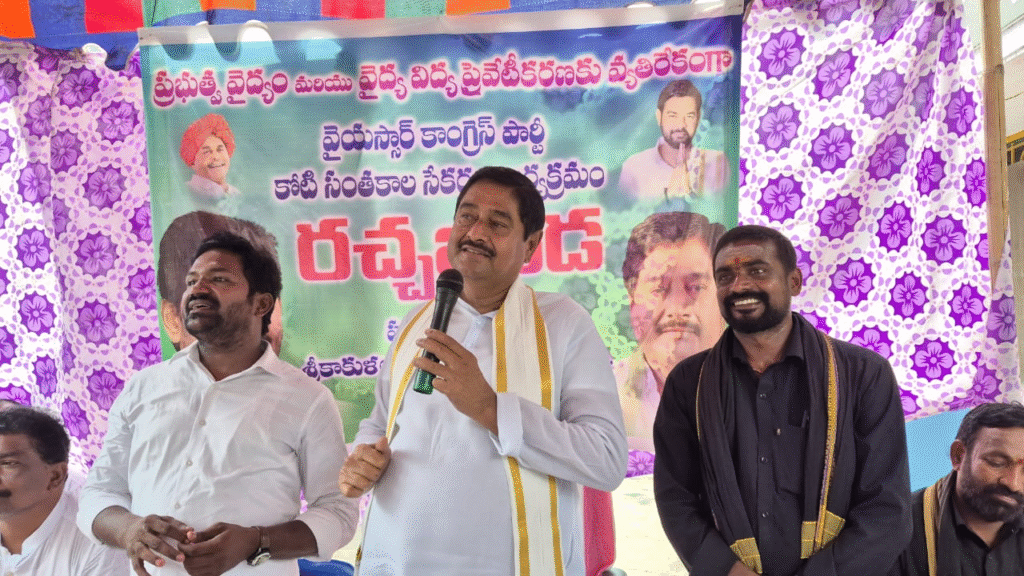 శ్రీకాకుళం, అక్టోబర్ 24(ఆంధ్రప్రభ): వైద్య విద్యను కార్పొరేట్ శక్తులకు ధారాదత్తం చేయవద్దని మాజీ మంత్రి ధర్మాన ప్రసాదరావు కోరారు. , పీపీపీ విధానంతో ప్రభుత్వం తన అధికారాలను కోల్పోయి పూర్తిగా ప్రైవేటు యాజమాన్యాలకు దాసోహం కావడం ఎంత మాత్రం భావ్యంగా లేదని, ఈ విధానంలో ఫ్రీ సీట్లు (కన్వీనర్ కోటా) పెరుగుతాయని చెప్పడం హాస్యాస్పదం అని అన్నారు. పట్టణంలోని హయాతినగరం, అవని స్కూల్ ఆఫ్ నర్సింగ్ (విశాఖ బీ కాలనీ – శ్రీకాకుళం నగరం)లో కోటి సంతకాల సేకరణ- రచ్చబండ కార్యక్రమం వైసీపీ నాయకులు నిర్వహించారు.