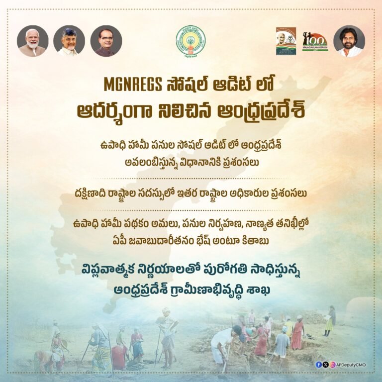 వెలగపూడి : మహాత్మా గాంధీ జాతీయ గ్రామీణ ఉపాధి హామీ పథకం ( MGNREGS) సోషల్ ఆడిట్లో ఆంధ్రప్రదేశ్ (AP) రాష్ట్రం దక్షిణాది రాష్ట్రాలకు ( South states) ఆదర్శంగా నిలిచిందని ఏపీ ఉప ముఖ్యమంత్రి పవన్ కళ్యాణ్ (Deputy CM pawan kalyan) తెలిపారు.