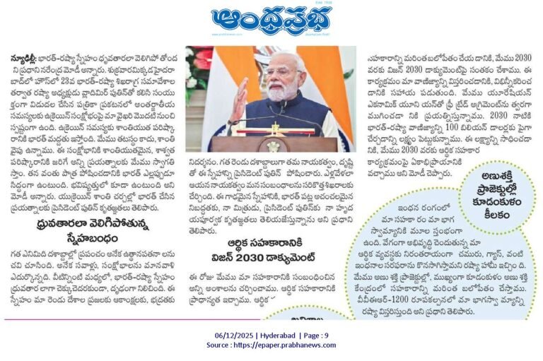గత ఎనిమిది దశాబ్దాల్లో ప్రపంచం అనేక ఉత్థానపతనాలను చవి చూసింది. అనేక సవాళ్లు, సంక్షోభాలను మానవాళి ఎదుర్కొన్నది. వీటిన్నింటి మధ్యలో, భారత్-రష్యా స్నేహం ధ్రువతార లాగా చెక్కుచెదరకుండా, దృఢంగా నిలిచింది. ఈ స్నేహం మా రెండు దేశాల ప్రజలకు ఆకాంక్షలకు, భద్రతకు నిదర్శనం. గత రెండు దశాబ్దాలుగా తమ నాయకత్వం, దృష్టితో ఈ స్నేహాన్ని ప్రెసిడెంట్ పుతిన్ (putin) పోషించారు. ఎళ్లవేళలా ఆయన నాయకత్వం మన సంబంధాలను సరికొత్త శిఖరాలకు చేర్చింది. ఈ గాఢమైన స్నేహానికి, భారత్ పట్ల అచంచలమైన నిబద్ధతకు, నా మిత్రుడు, ప్రెసిడెంట్ పుతిన్కు నా హృదయపూర్వక కృతజ్ఞతలు తెలియజేస్తున్నాను అని ప్రధాని