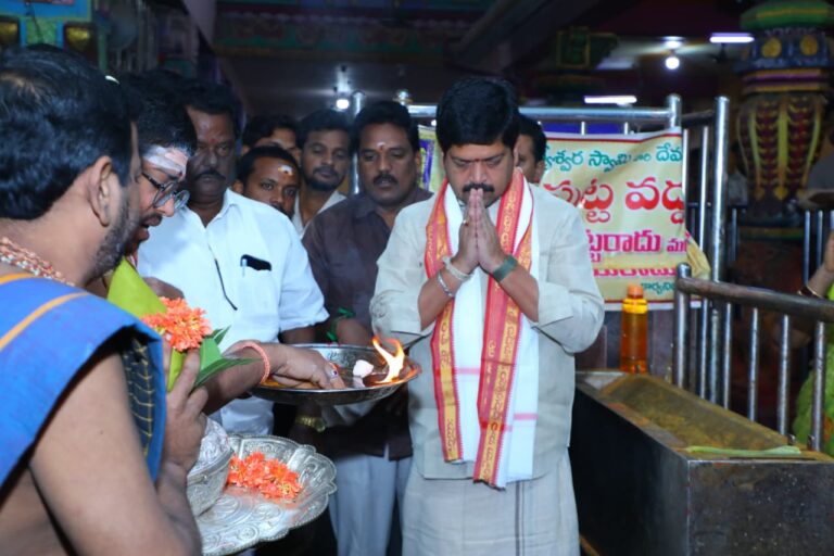 Mopidevi temple, కృష్ణా ప్రతినిధి, ఆంధ్రప్రభ : కృష్ణా జిల్లాలోని మోపిదేవిలోని శ్రీ వల్లీదేవసేన సమేత శ్రీ సుబ్రహ్మణ్యేశ్వర స్వామివారిని రాష్ట్ర గనుల శాఖ మంత్రి కొల్లు రవీంద్ర (Kollu Ravindra) మంగళవారం ఉదయం దర్శించుకున్నారు. ఆలయ అర్చకులు, ఆలయ కార్యనిర్వహణాధికారి దాసరి శ్రీరామ వర ప్రసాదరావు ఆయనకు ఘనంగా స్వాగతం పలికారు. తొలుత నాగ పుట్ట వద్ద పాలు పోసి స్వామివారిని దర్శించుకున్నారు. ఆలయ అర్చకులు స్వామివారి పేరిట విశేష పూజలు చేయించారు. అనంతరం ఆలయ ఈవో స్వామి వారి చిత్రపటం, ప్రసాదాలను మంత్రికి అందజేశారు. ఈ కార్యక్రమంలో టీడీపీ నాయకులు, అభిమానులు పాల్గొన్నారు.