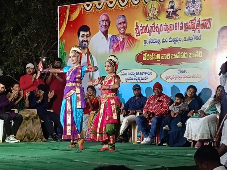 Nalgonda, గట్టుప్పల, ఆంధ్రప్రభ : నల్లగొండ జిల్లా గట్టుప్పల మండలంలోని తేరటుపల్లి గ్రామంలోని శ్రీ మార్కండేశ్వర స్వామి దేవాలయంలో 81వ బ్రహ్మోత్సవాల సందర్భంగా శనివారం సాయంత్రం మాజీ సర్పంచ్ వీరమల్ల శ్రీశైలం గౌడ్ స్థానిక దేవాలయ ప్రాంగణంలో ఏర్పాటు చేసిన సాంస్కృతిక కార్యక్రమాలు భక్తులను,ఆహుతులను విశేషంగా ఆకట్టుకున్నాయి. ఈ సందర్భంగా సినీ, జానపద కళాకారులు సంయుక్తంగా ప్రదర్శించిన కల నృత్యాలు, భరతనాట్యం, గేయాలు ప్రేక్షకులను మంత్రముగ్ధులను చేశాయి. సాంప్రదాయ జానపద కళారూపాలకు ఆధునిక సినీ శైలిని జోడించి చేసిన ప్రదర్శనలు ప్రత్యేక ఆకర్షణగా నిలిచాయి.