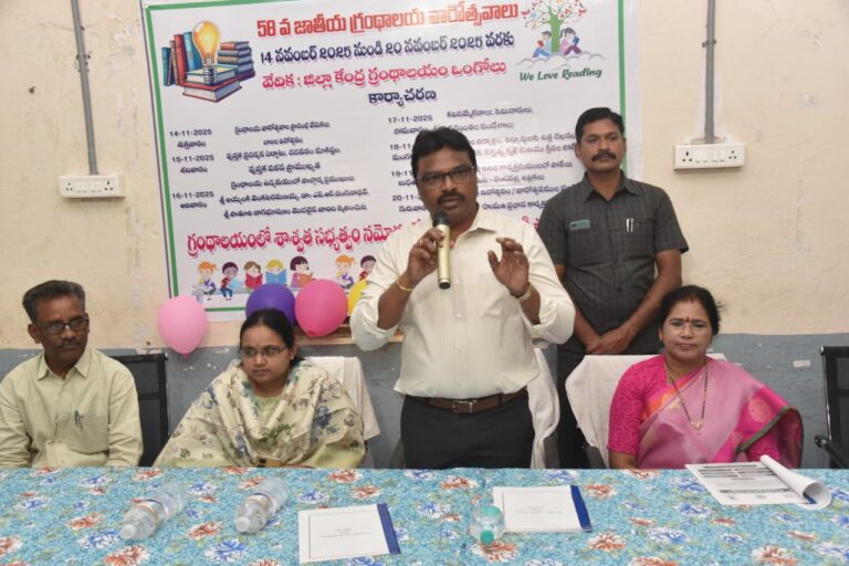 Ongole, ఆంధ్రప్రభ బ్యూరో : మేధో వికాసానికి పుస్తక పఠనమే ఉత్తమ మార్గమని జిల్లా కలెక్టర్ పి.రాజాబాబు (Collector P.Rajababu) చెప్పారు. అందుకే విద్యార్థులు అందరూ సెల్ఫోన్ వదిలి పుస్తకంతో సహవాసం చేయాలని ఆయన పిలుపునిచ్చారు. శుక్రవారం 58వ జాతీయ గ్రంథాలయ వారోత్సవాలను పురస్కరించుకుని ఒంగోలులోని (Ongole) జిల్లా గ్రంథాలయంలో చేపట్టిన ప్రారంభ కార్యక్రమంలో ఆయన ముఖ్య అతిథిగా పాల్గొన్నారు. ఒంగోలు మేయర్ శ్రీమతి గంగాడ సుజాతతో కలిసి ముందుగా సరస్వతి దేవి విగ్రహానికి, అనంతరం బాలల దినోత్సవాన్ని పురస్కరించుకుని జవహర్ లాల్ నెహ్రూ (Nehro) చిత్రపటానికి కూడా వారు పూలమాల వేసి పుష్పాంజలి ఘటించారు.