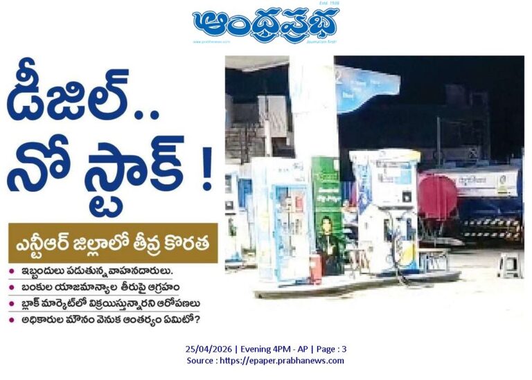 ఆంధ్రప్రభ, ఎన్టీఆర్ బ్యూరో : ఎన్టీఆర్ జిల్లాలో డీజిల్ కొరత తీవ్రంగా మారింది. నందిగామ, జగ్గయ్యపేట, పెనుగంచిప్రోలు వంటి ప్రాంతాలతో పాటు విజయవాడ నగరంలో పెట్రోల్ బంకుల వద్ద “నో స్టాక్” బోర్డులు కనిపిస్తుండగా, రికమండేషన్ ఉన్నవారికే పరిమితంగా ఇంధనం ఇస్తున్నారన్న ఆరోపణలు వినిపిస్తున్నాయి. డీజిల్ దొరకక వాహనదారులు తీవ్ర ఇబ్బందులు పడుతుండగా, ఆటో డ్రైవర్లు తమ వాహనాలు నిలిపివేసే పరిస్థితి ఏర్పడింది. ఇటు వ్యవసాయ పనులు కూడా జరుగుతున్న తరుణంలో డీజిల్ లభ్యత కొరవడంతో ఆ ప్రభావం స్పష్టంగా కనిపిస్తోంది.